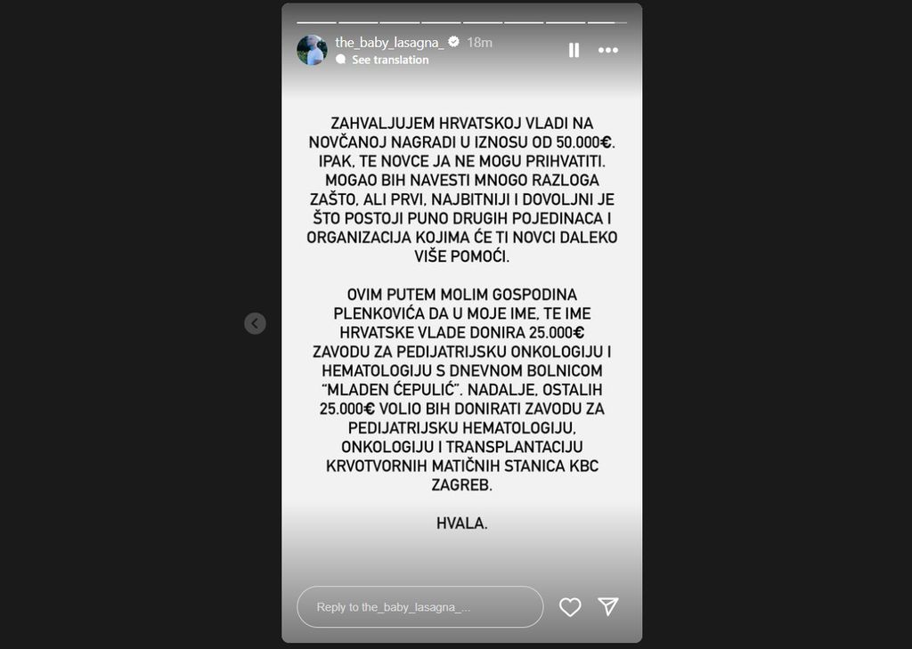 “Zahvaljujem hrvatskoj Vladi na novčanoj nagradi u iznosu od 50.000 eura. Ipak, ja taj novac ne mogu prihvatiti. Mogao bih navesti mnogo razloga zašto, ali prvi, najbitniji i dovoljan jest što postoji puno drugih pojedinaca i organizacija kojima će taj novac puno više pomoći. Ovim putem molim gospodina Plenkovića da u moje ime te ime hrvatske Vlade donira 25.000 eura Zavodu za pedijatrijsku onkologiju i hematologiju s dnevnom bolnicom ‘Mladen Ćepulić’. Nadalje, ostalih 25.000 eura volio bih donirati Zavodu za pedijatrijsku hematologiju, onkologiju i transplantaciju krvotvornih matičnih stanica KBC-a Zagreb. Hvala”, napisao je na svom Instagram storyju.