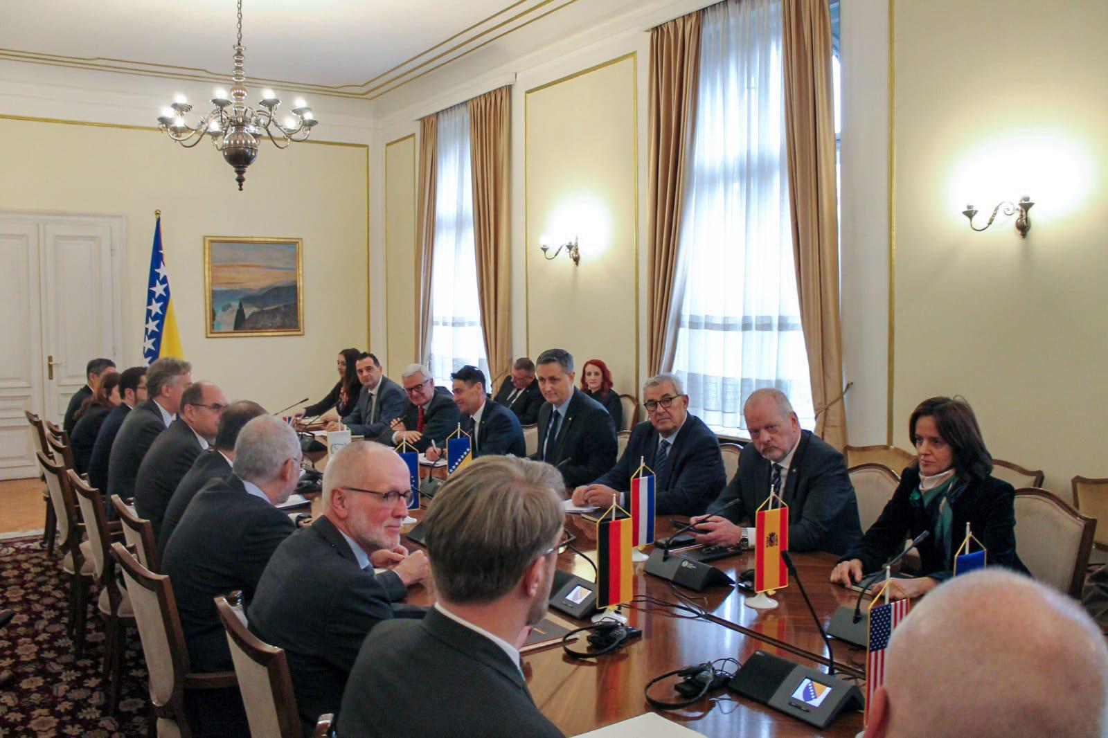 Tokom sastanka razgovarano je o najopasnijim udarima na temelje Dejtonskog mirovnog sporazuma i ustavni poredak Bosne i Hercegovine u režiji Milorada Dodika i njegovih sljedbenika.