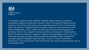 Britanska ambasada u BiH oglasila se u povodu jučerašnjeg usvajanja Zakona o neprimjenjivanju odluka Ustavnog suda Bosne i Hercegovine na prostoru Republike Srpske.