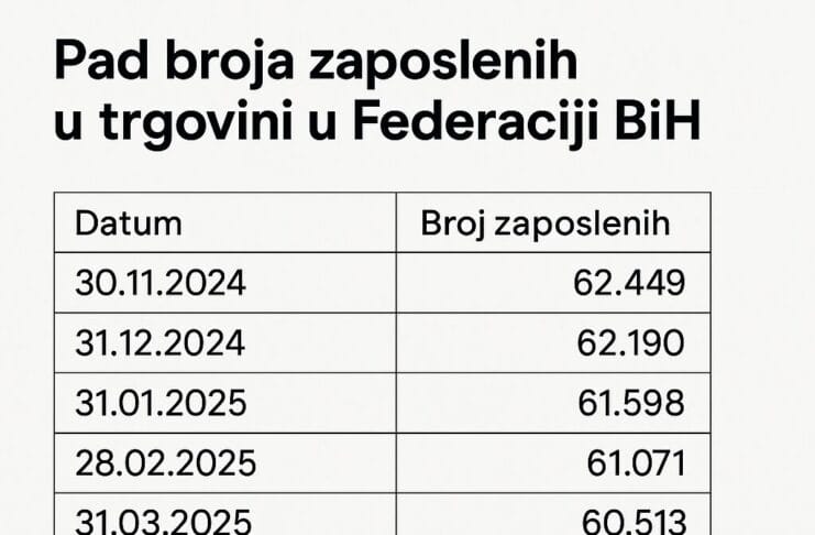Prema službenim podacima Porezne uprave FBiH, na dan 31. decembra 2024. godine broj zaposlenih u djelatnosti trgovine iznosio je 62.190. Do kraja marta 2025. taj broj pao je na 60.513, što predstavlja pad za 1.677 zaposlenih u sektoru trgovine na malo, osim trgovine motornim vozilima i motociklima.