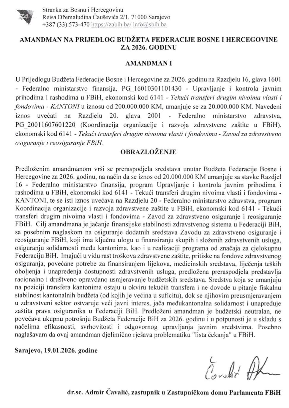 „Veliko hvala delegatima Doma naroda FBiH koji su potvrdili amandman koji mi je ranije prihvatio Zastupnički dom, a u vezi Budžeta za 2026. godinu“, rekao je Ćavalić.