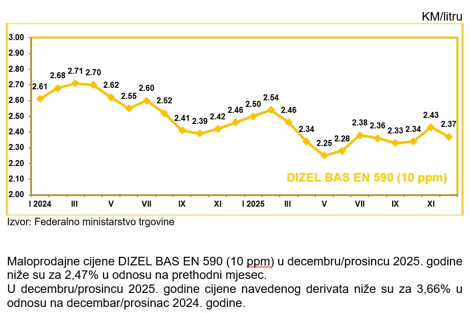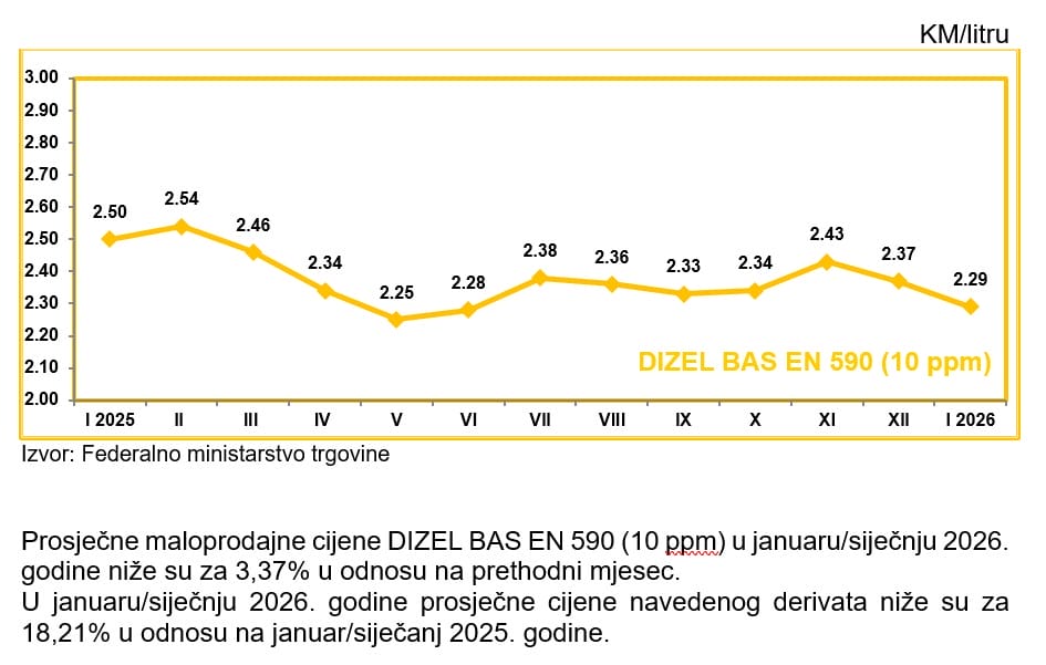 „Svakodnevno pratimo kretanje cijena na međunarodnom i domaćem tržištu, te analiziramo obavještenja o promjenama koje dostavljaju distributeri naftnih derivata. Podsjećamo da je i dalje na snazi odluka Vlade Federacije BiH o ograničenju marži na naftne derivate, prema kojoj maksimalna marža u maloprodaji može iznositi 0,25 KM po litru, dok je za veleprodaju ograničena na 0,06 KM po litru“, saopštilo je Federalno ministarstvo trgovine.