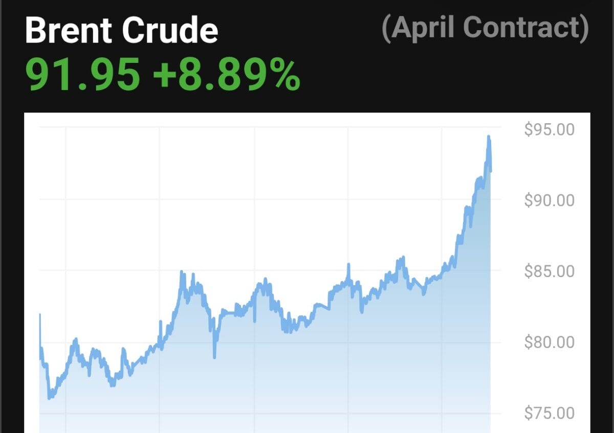 Cijene nafte na svjetskom tržištu i dalje bilježe snažan rast, a prema posljednjim podacima vrijednost referentne nafte Brent dostigla je oko 91,95 dolara po barelu, što predstavlja skok od gotovo devet posto u odnosu na prethodne dane.