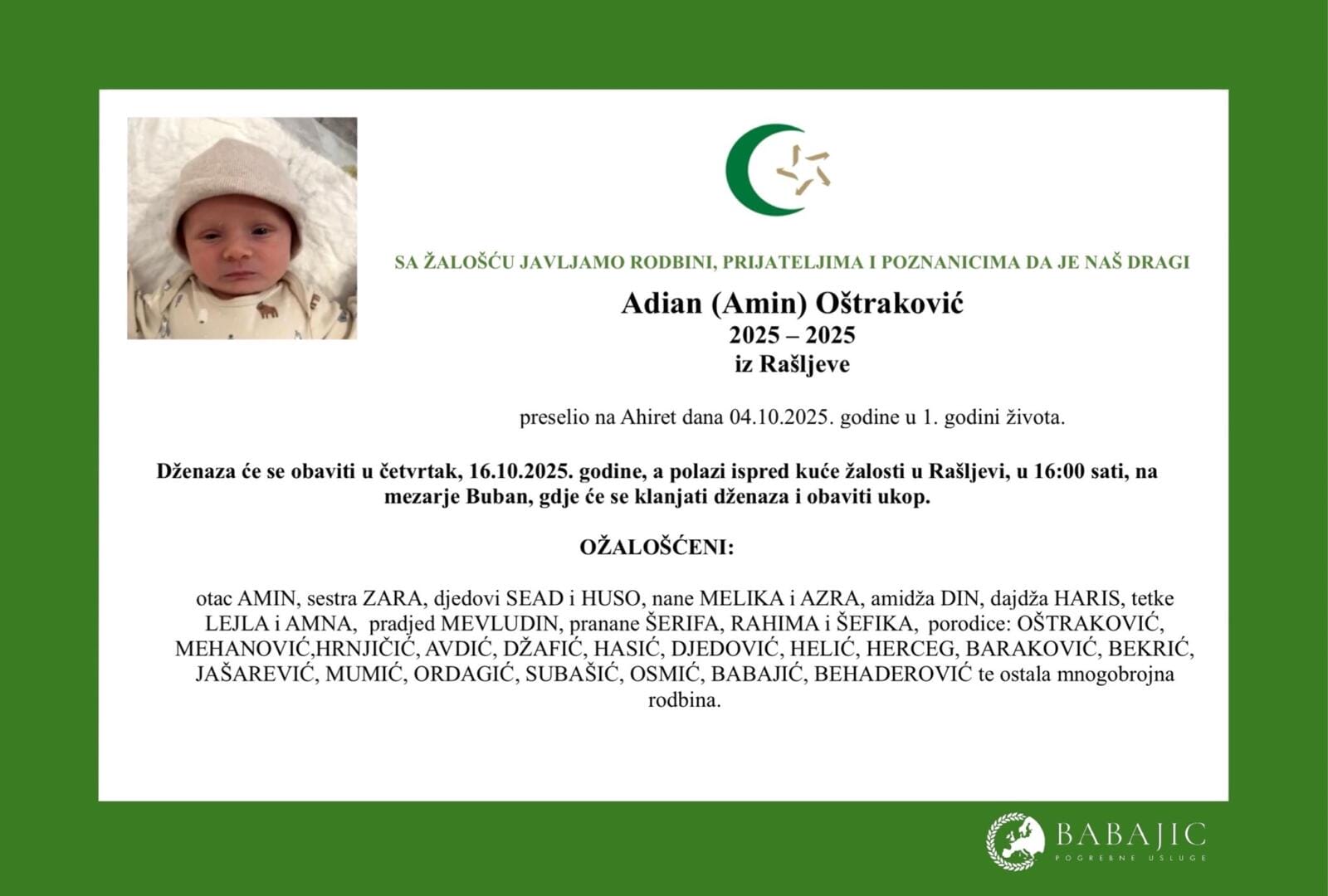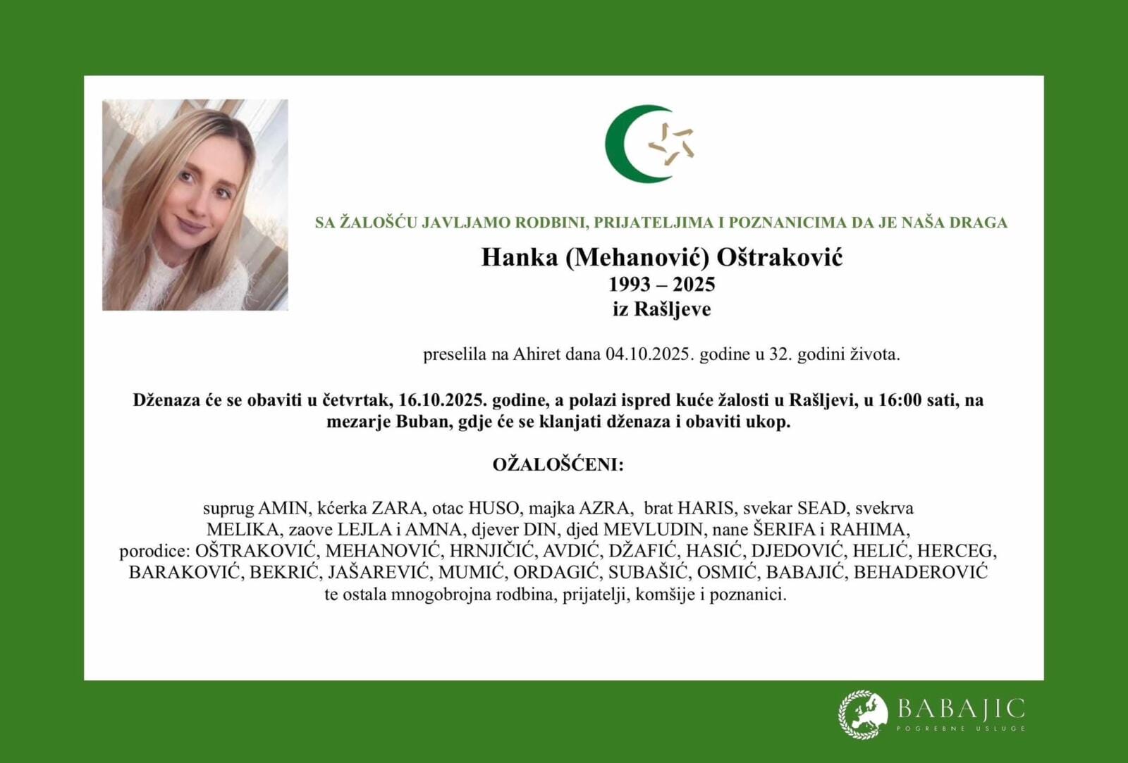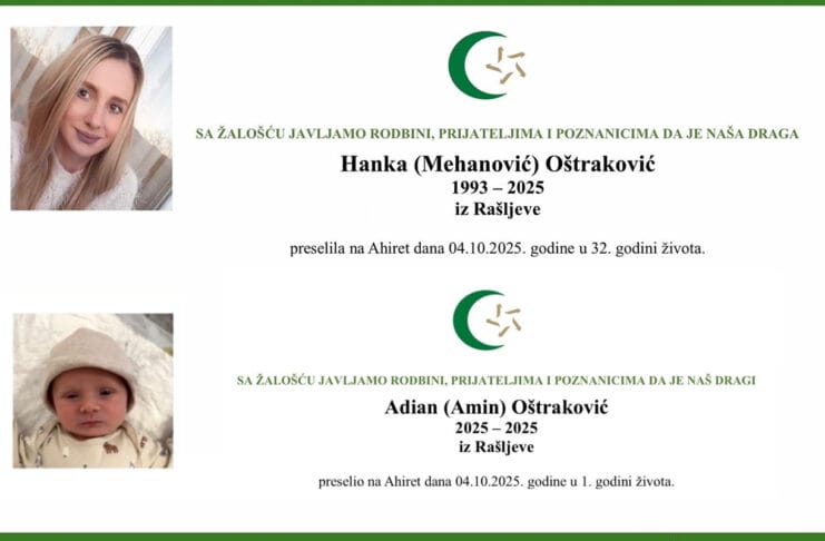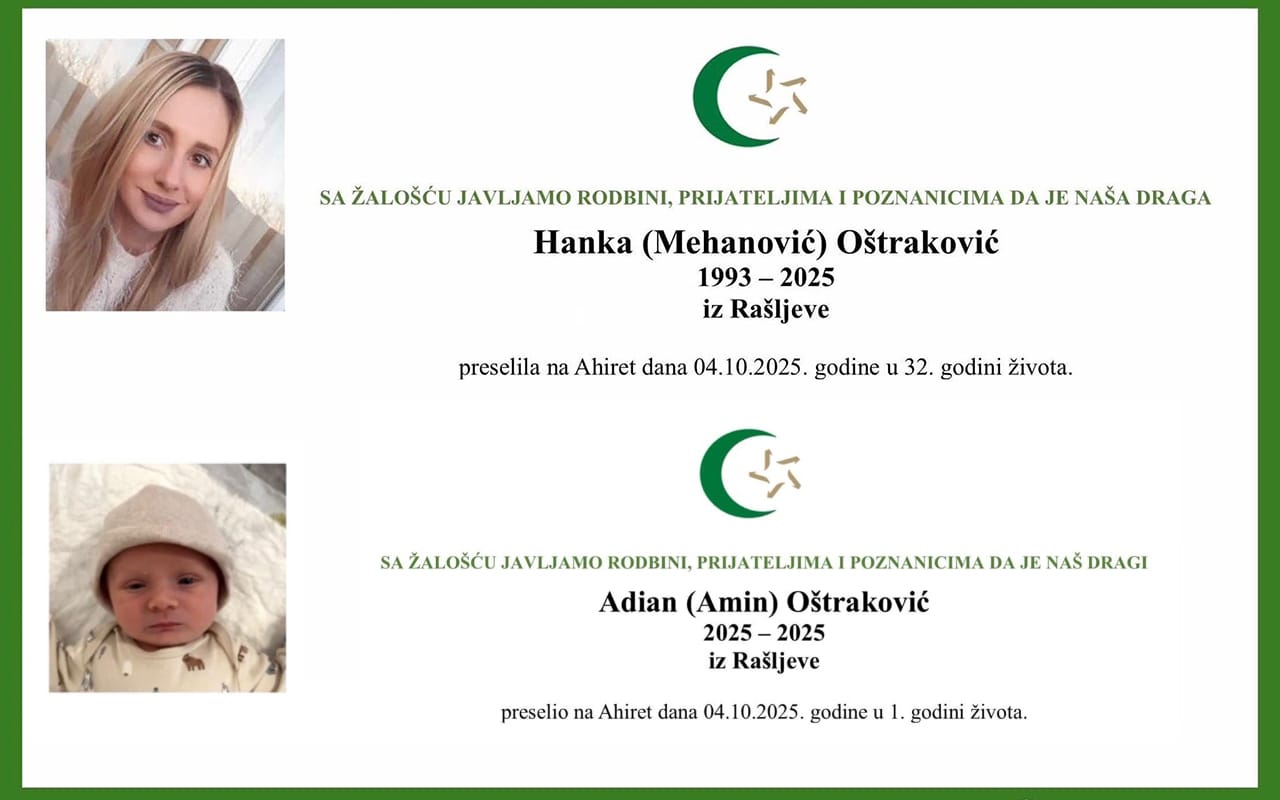 Tragedija koja je potresla Bosnu i Hercegovinu i dijasporu doživjet će svoj tužni epilog sutra, kada će se u Rašljevi kod Gračanice klanjati dženaza Hanki (Mehanović) Oštraković i njenom tek rođenom sinu Adianu.