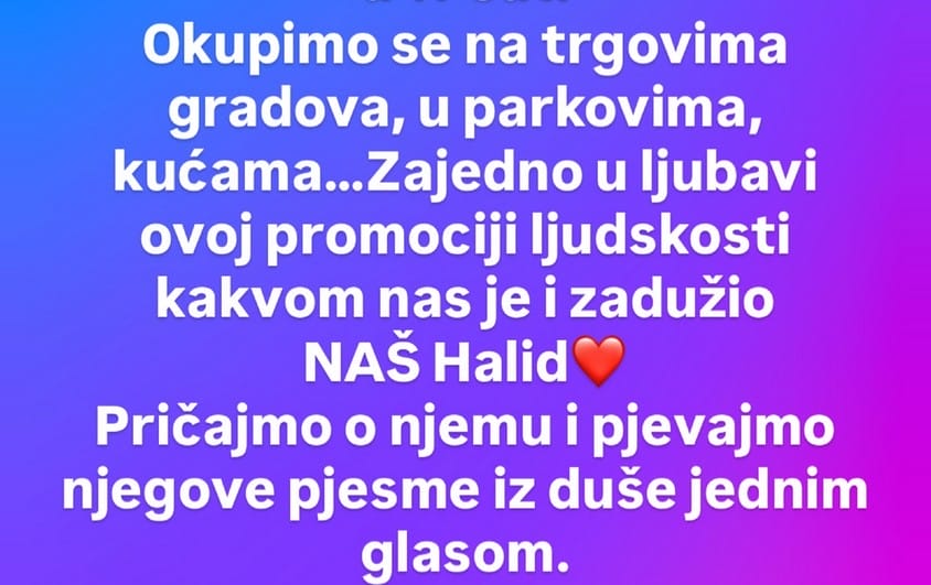 „Nedjelja u 17 sati, cijeli svijet neka zna da je otišao naš Halid“, poručio je Bešlagić, uz apel građanima da dijele objavu i pridruže se ovoj simboličnoj gesti jedinstva i poštovanja.