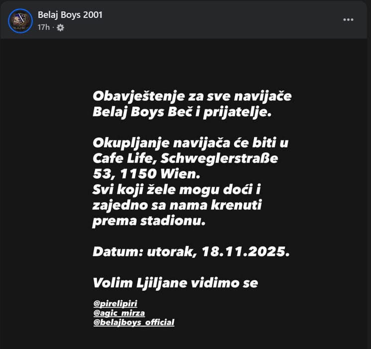 U utorak nogometnu reprezentaciju Bosne i Hercegovine očekuje odlučujući duel kvalifikacija za Svjetsko prvenstvo protiv Austrije u Beču, a bh. navijači već pristižu u austrijsku prijestolnicu kako bi pružili podršku Zmajevima. Prema prvim informacijama, u grad je stiglo nekoliko hiljada bh. državljana, a Beč već odjekuje navijačkim pjesmama i energijom koja najavljuje važne sate pred utakmicu.