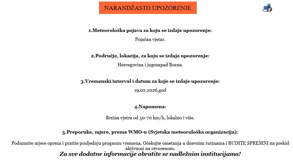 Federalni hidrometeorološki zavod izdaje narandžasto upozorenje za 19. februar 2026. godine zbog prognoziranih povremenih jakih do olujnih udara vjetra južnog pravca na jugu i jugozapadu Bosne i Hercegovine.
