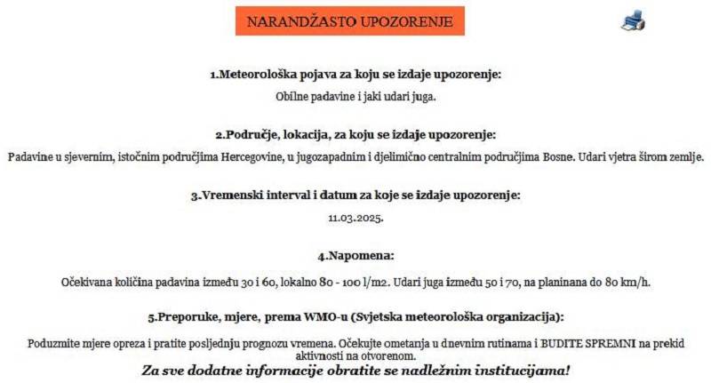 Federalni hidrometeorološki zavod izdao je narandžasto upozorenje zbog obilnih padavina i jakog udara vjetra.