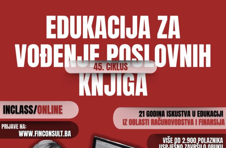 U toku su prijave na 45. ciklus edukacije za vođenje poslovnih knjiga privrednih društava i obrtnika, koje će organizirati edukativno-konsultantska kuća FINconsult Tuzla, realizovati u periodu novembar 2025. – decembar 2025. godine.