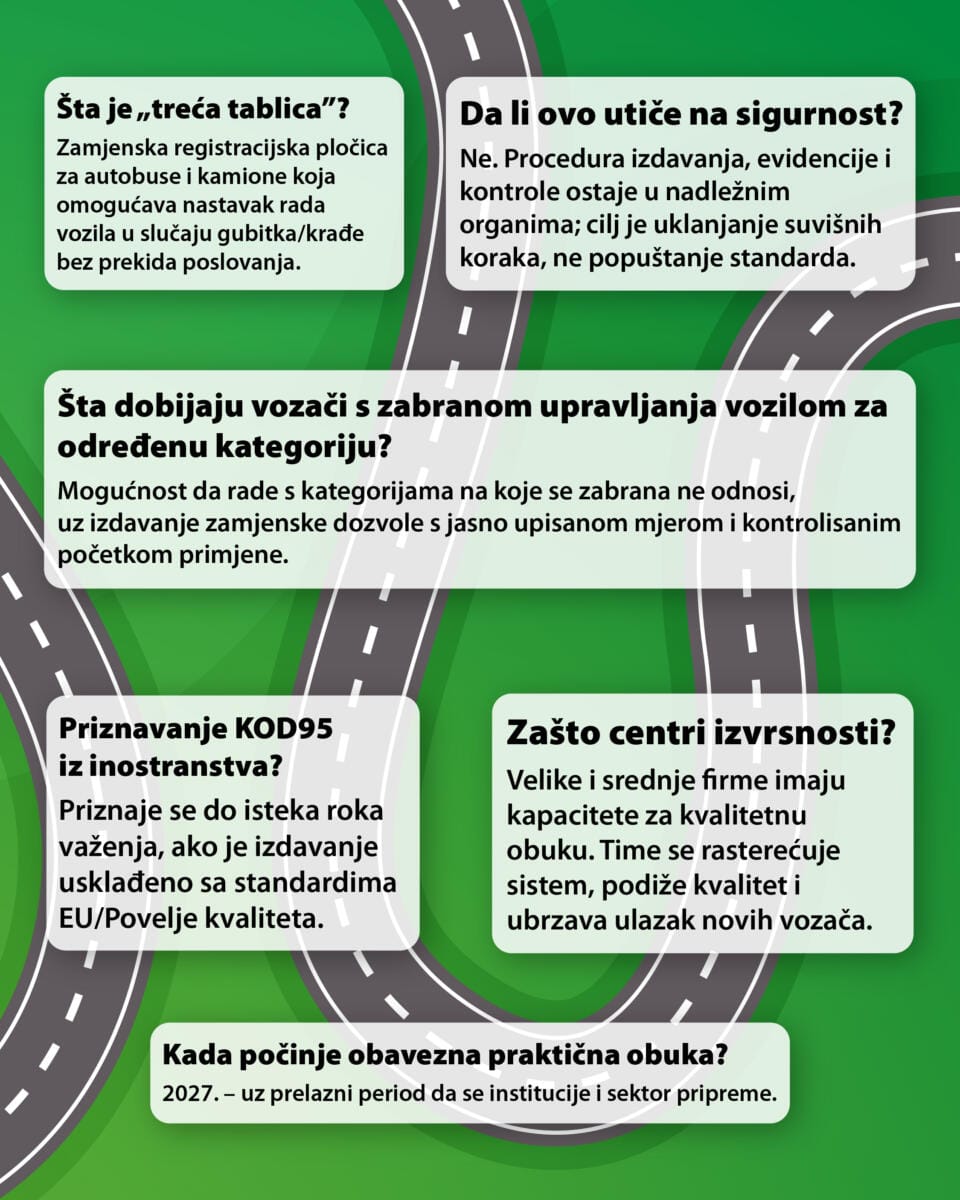 Izmjene Pravilnika o registraciji vozila donose mogućnost redovnog i hitnog izdavanja zamjenske, tzv. treće tablice, što prijevoznicima omogućava kontinuitet rada u slučaju gubitka ili krađe, bez dodatnih troškova i zastoja. Ukida se i obaveza objavljivanja gubitka tablica u Službenim novinama, čime se štedi vrijeme i novac. Obrasci i upute prema Ministarstvu su pojednostavljeni kako bi se izbjegla nepotrebna dopisivanja.