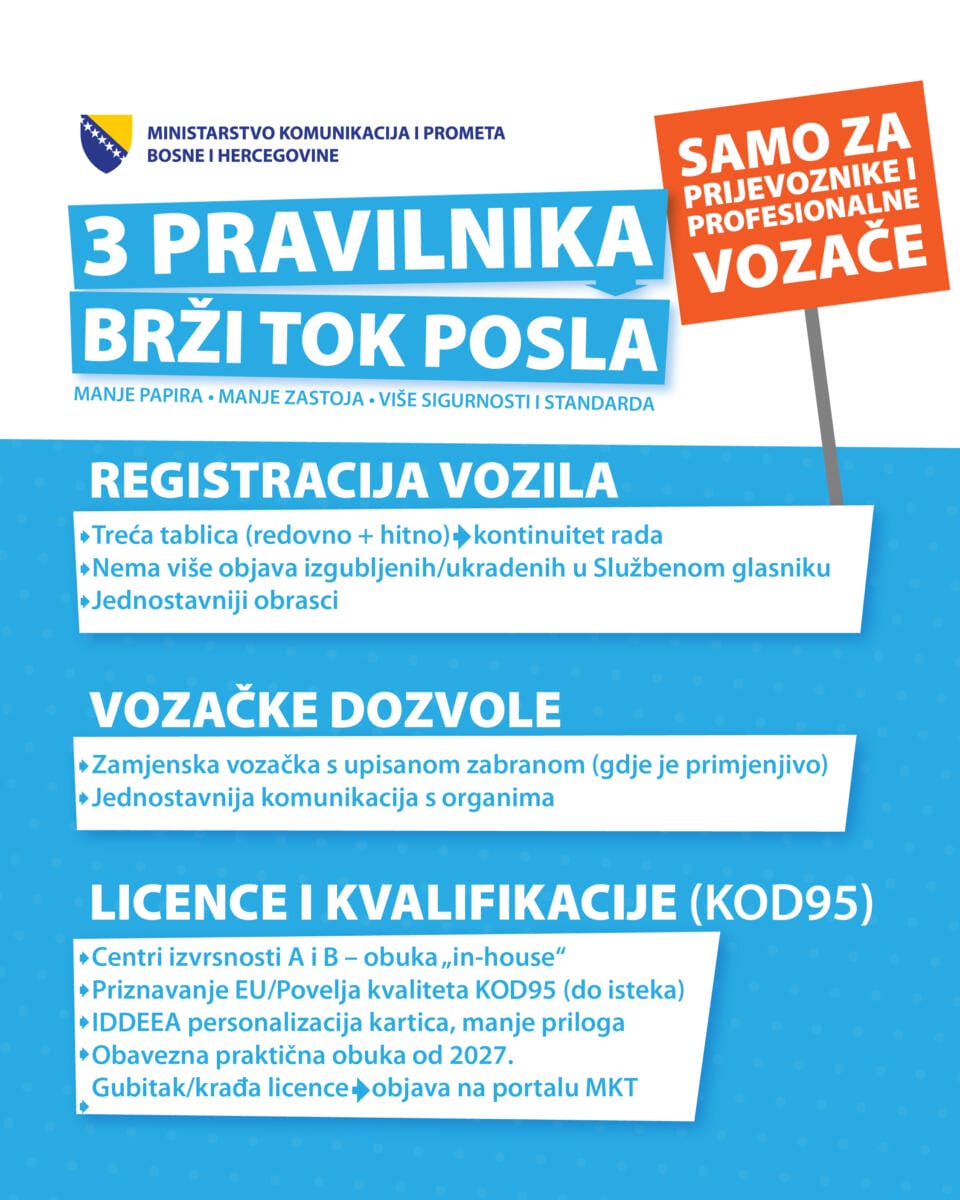 Ministarstvo komunikacija i prometa Bosne i Hercegovine ispunilo je obaveze preuzete tokom prijevozničkih protesta, jer su izmjene tri pravilnika već objavljene u Službenim novinama BiH. Riječ je o setu propisa koji smanjuju administrativne prepreke, ubrzavaju postupke i usklađuju domaće propise s evropskim standardima u sektoru profesionalnog prijevoza.