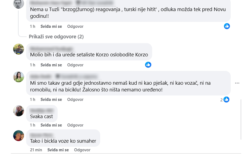 “Vozači bicikla dužni su kretati se što bliže desnoj ivici kolovoza ili biciklističkom stazom, ako postoji, dok je pješačka zona namijenjena isključivo kretanju pješaka. Ulazi u pješačku zonu Tuzle obilježeni su saobraćajnim znakovima. Policijska stanica Centar svakodnevno nadzire Trg slobode i pješačku zonu, s ciljem prevencije i sankcionisanja prekršaja, posebno tokom ljetne sezone kada je povećan broj pješaka”, naveli su iz Uprave policije MUP-a TK.