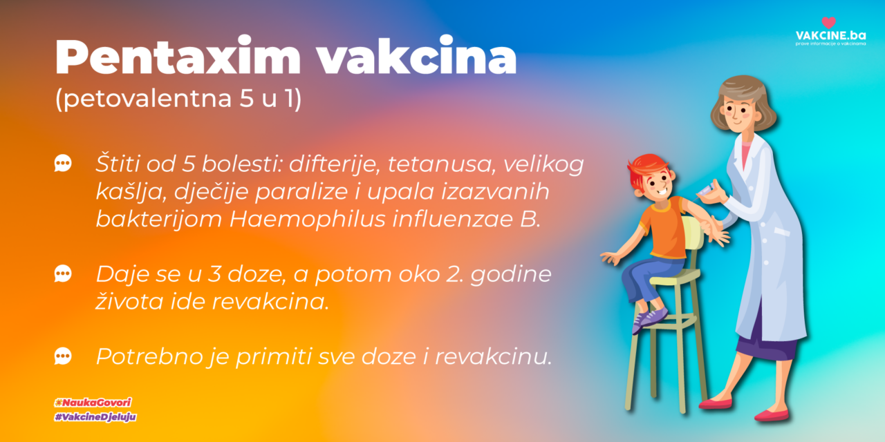 Pentaxim vakcina/cjepivo u sebi sadrži zapravo pet vakcina i zato je zovemo i “petovalentna vakcina” ili “5u1”. Ona štiti od difterije, tetanusa, velikog kašlja (hripavac, pertusis), od dječije paralize i bakterije zvane Haemophilus influenzae B, koja izaziva upale. Sva djeca moraju primiti sve doze ove vakcine kako bi bila optimalno zaštićena od smrtonosnih, vrlo ozbiljnih bolesti.