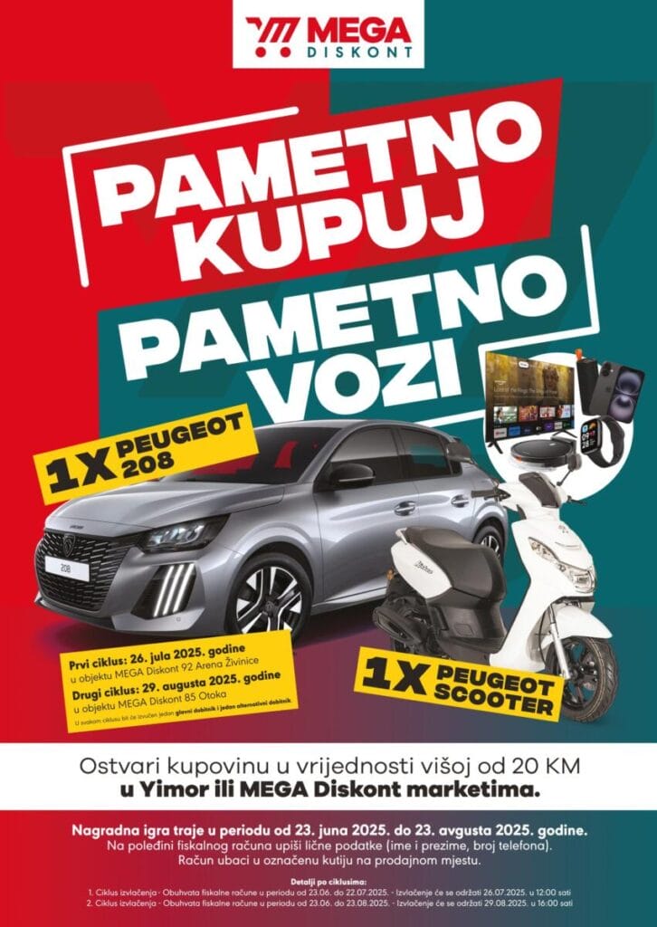 U sklopu kampanje MEGA Diskonta, u toku je i nagradna igra „Pametno kupuj, pametno vozi“, kroz koju naši vjerni kupci mogu osvojiti pametne nagrade, uključujući i mogućnost osvajanja automobila, te drugih vrijednih poklona.