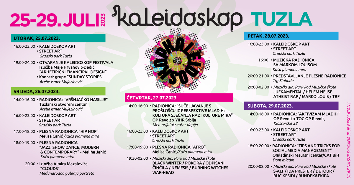 Muzički dio festivala se održava od 27. do 29 jula u parku kod Muzičke škole Tuzla. Svečano otvaranje 13.Festivala umjetnosti Kaleidoskop je u utorak 25.jula/19 sati izložbom Maje Hrvanović-Dedić “Arhetipični Emancipal Design” i koncertom sarajevske grupe “SUNDAY STORIES” /20 sati / Atelje Ismet Mujezinović – ULAZ SLOBODAN !!!