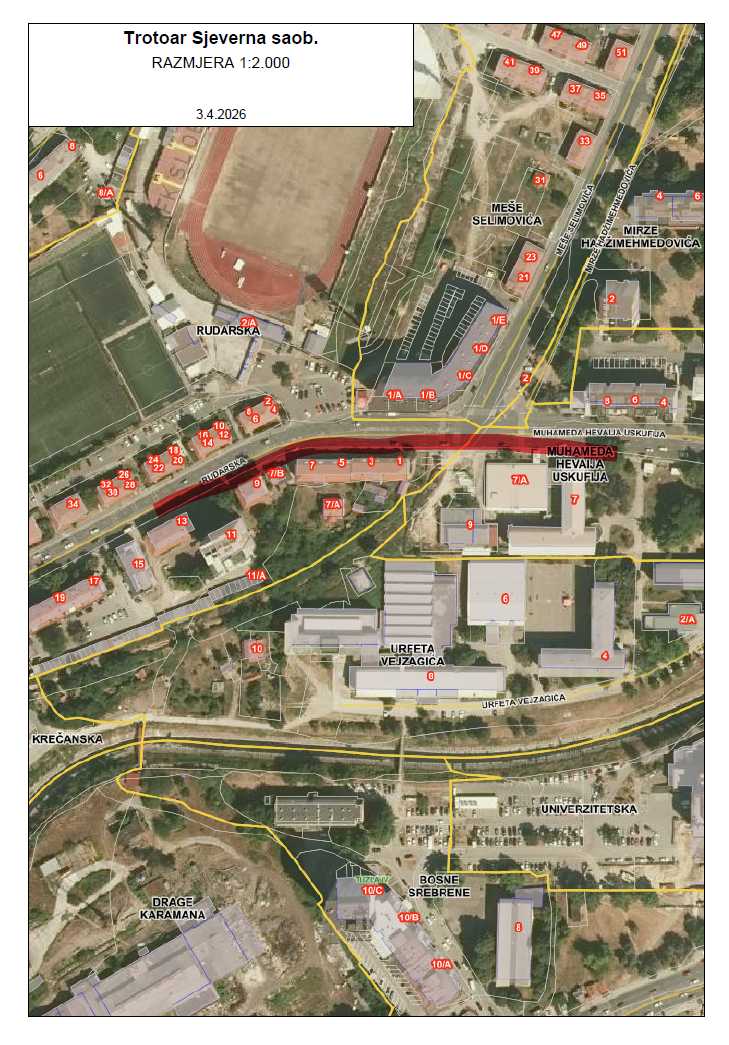Službe za komunalne poslove, izgradnju i poslove mjesnih zajednica, obavještava građane da će zbog izvođenja građevinskih radova na sanaciji i asfaltiranju trotara na Sjevernoj saobraćajnici na potezu dijela ulica Rudarska i Muhameda Hevaija Uskufija (desna strana Sjeverne gradske saobraćajnice gledano iz pravca Irca), doći do izmjene režima saobraćaja od ponedeljka 06.04.2026. godine pa do okončanja radova.