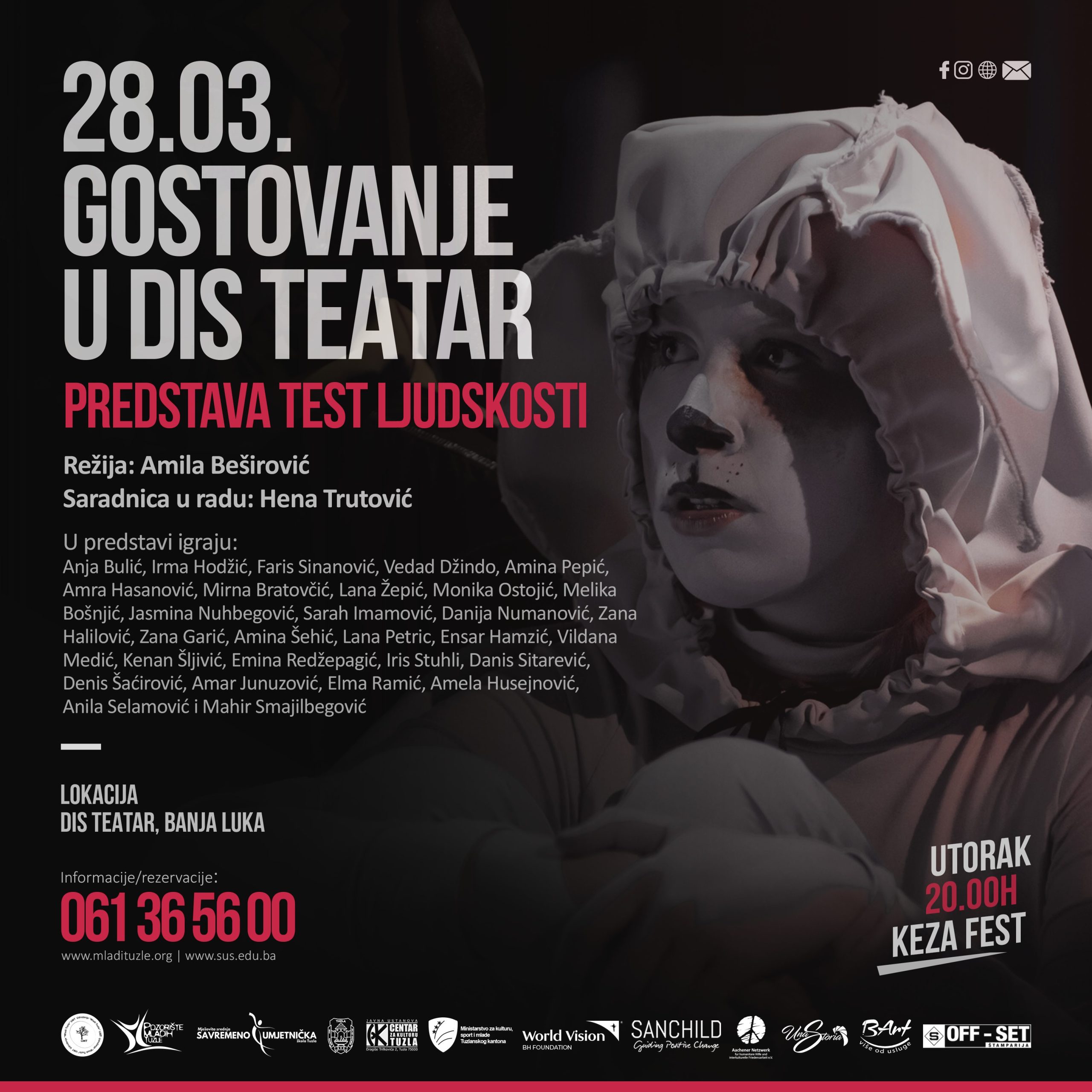 Arnela Šiljković - Bojić - Kao dio programa „19. Dana Mladih Tuzle“ u utorak, 28.3.2023. godine u 20.00h predstava „Test ljudskosti“ biće izvedena na „Keza festu“ u Banjoj Luci...