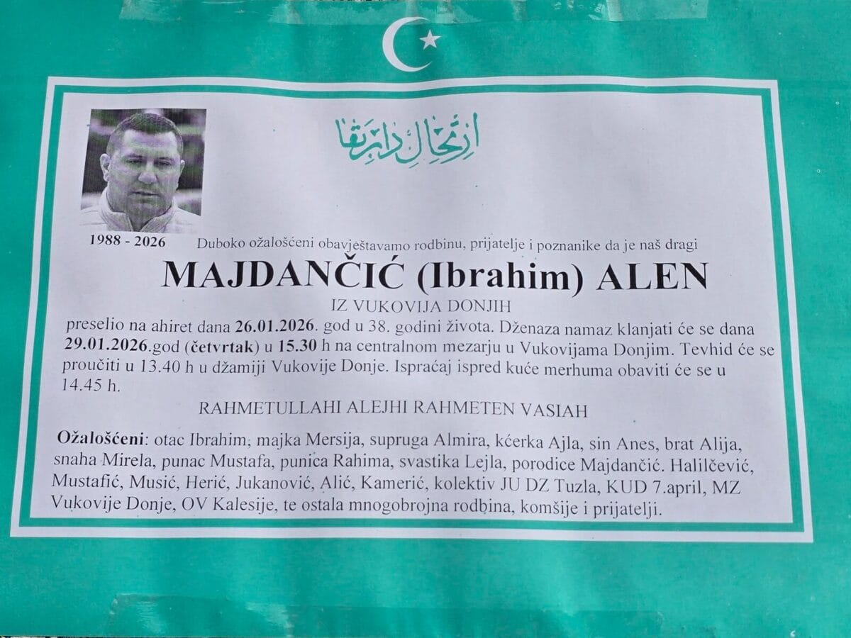 Dženaza-namaz Alenu Majdančiću klanjat će se u četvrtak, 29. januara 2026. godine, sa početkom u 15.30 sati na centralnom mezarju u Vukovijama Donjim. Tevhid će biti proučen istog dana u 13.40 sati u džamiji Vukovije Donje, dok će se ispraćaj ispred kuće merhuma obaviti u 14.45 sati.