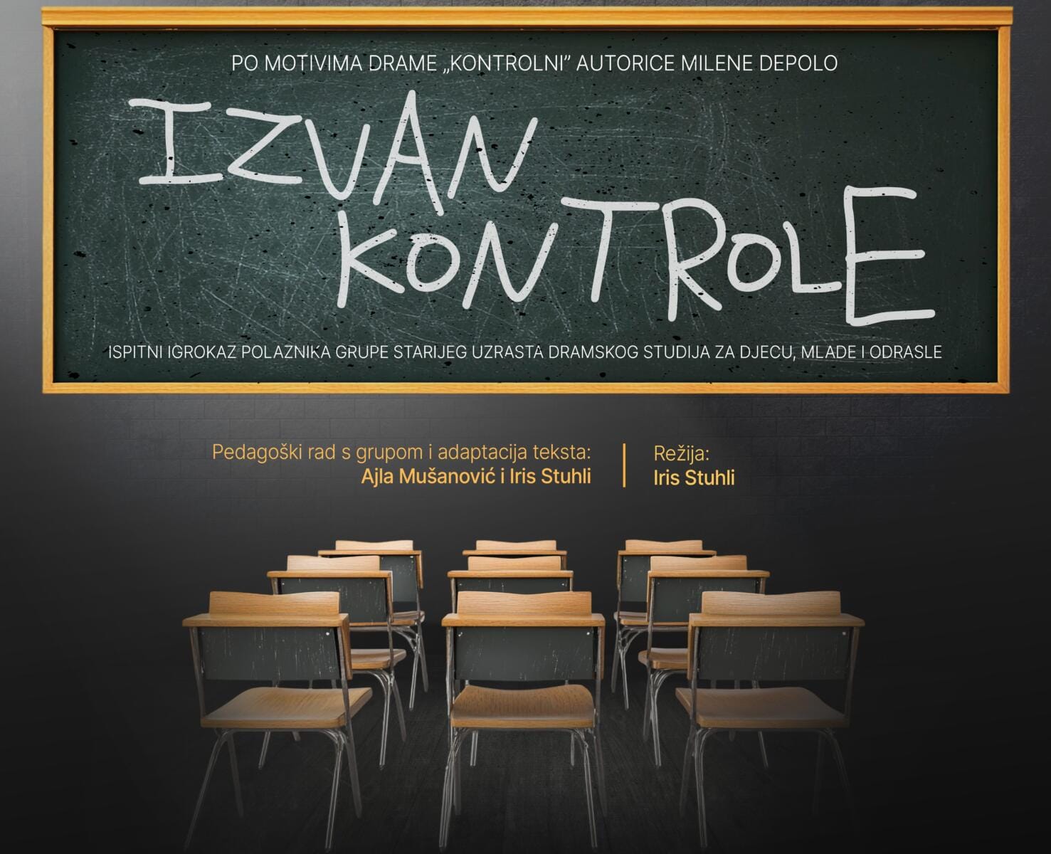 Dramski studio za djecu, mlade i odrasle Pozorišta mladih Tuzle, koji djeluje kontinuirano već 22 godine kroz primjenu dramske pedagogije, pripremio je ispitni igrokaz „Izvan kontrole“. Predstava je nastala po motivima drame „Kontrolni“ autorice Milene Depolo, a realizuje se uz podršku Grada Tuzle, Ministarstva za kulturu, sport i mlade Tuzlanskog kantona i saglasnost Ministarstva obrazovanja i nauke TK.