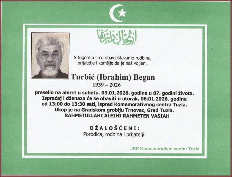 „Tužna srca obavještavamo javnost da nas je danas, 3. januara 2026. godine, napustio veliki čovjek i umjetnik Began Turbić“, saopćeno je iz Centar za kulturu Tuzla, uz podsjećanje da je njegova Retrospektivna izložba slika, plakata i instalacija nedavno otvorena u Međunarodna galerija portreta Tuzla.