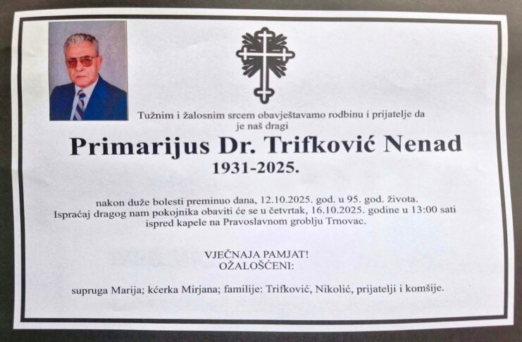 Nakon duže bolesti, dr. Trifković je preminuo. Ispraćaj će biti obavljen u četvrtak, 16. oktobra 2025. godine u 13 sati, ispred kapele na Pravoslavnom groblju Trnovac.