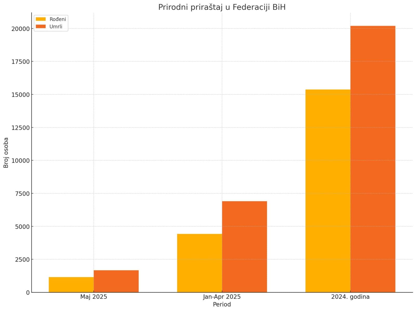 Kada je riječ o cijeloj 2024. godini, u Federaciji BiH rođeno je 15.375 djece, dok je preminulo 20.195 osoba, čime je prirodni priraštaj u toj godini iznosio -4.820.