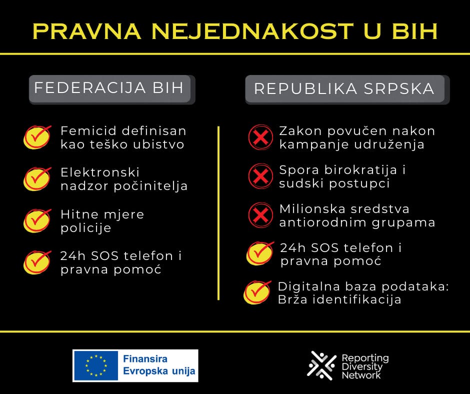 Međutim, femicid još uvijek nije definisan kao posebno krivično djelo na državnom nivou, niti postoji takva odredba u Krivičnom zakoniku Republike Srpske, zbog čega pravna zaštita žena nije ujednačena širom zemlje. Naime, nedavno objavljeno istraživanje Detektora pokazuje da je u Republici Srpskoj proces tekao u potpuno suprotnom smjeru. Iako je sličan nacrt zakona bio u proceduri, on je povučen nakon agresivne kampanje antirodnih udruženja.