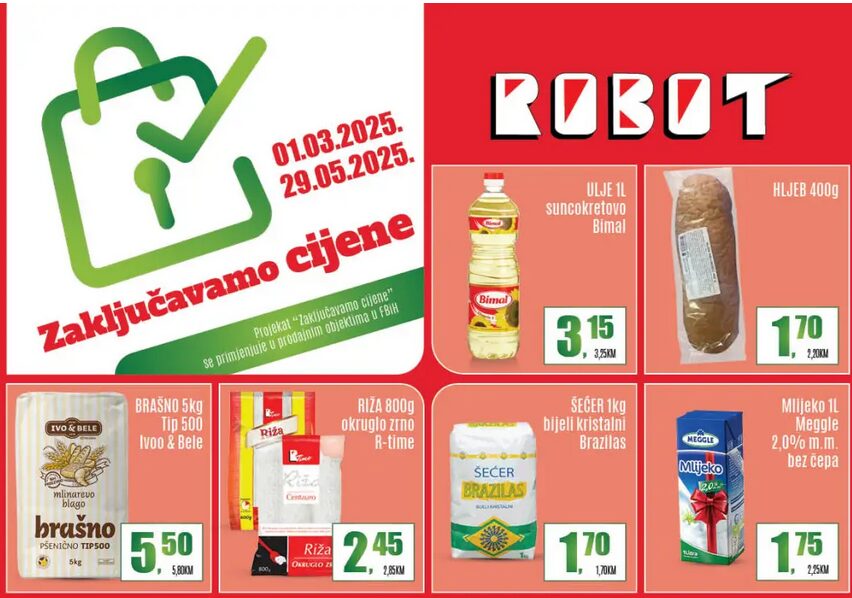 RTV Slon - Vijesti - ROBOT objavio listu zaključanih cijena ROBOT objavio listu zaključanih cijena RTV SLON01.03.2025. 11:30 Trgovački lanac ROBOT objavio je listu cijena koje će biti zaključane do 29. majaSpisak proizvoda koji učestvuju u projektu, te njihove cijene možete pogledajte u nastaku: DijelitiFacebookTwitterPinterestWhatsAppViber Tagsrobotzakljucavamo cijenezaključavanje cijenapročitajte i ovo VijestiOd 1. septembra prestaje kontrola cijena u FBiH, ukida se lista... 28.08.2025. 12:32 PROMOPreuređeni market ROBOT u Tuzli donosi posebne cijene i raznovrsnu ponudu 18.08.2025. 12:23 BiHAkcija “Zaključavamo cijene” produžena do 1. septembra 02.06.2025. 17:01 IstaknutoNeki neće odmarati: Kako će najveći trgovački lanci raditi tokom praznika? 29.04.2025. 17:19 IstaknutoZbog kršenja odluke o ‘zaključavanje cijena’ za šest dana izrečene kazne... 13.03.2025. 13:02 IstaknutoBingo zaključao cijene 65 artikala 07.03.2025. 12:34 KulturaCPR Tuzla: Magija plesa u četvrtak na sceni Narodnog pozorišta Tuzla 08.12.2025. 13:34 VijestiPotpisan Memorandum o saradnji Federalne agencije za upravljanje oduzetom imovinom i Registra vrijednosnih papira 08.12.2025. 13:09 IstaknutoPlanska isključenja električne energije u TK 08.12.2025. 13:01 IstaknutoKošarac nakon sjendice Vijeća ministara: Sarajevska žvaka je sažvakana 08.12.2025. 12:06 MagazinVelika zarada u novoj godini čeka ove horoskopske znakove 08.12.2025. 11:24 Učitati više
