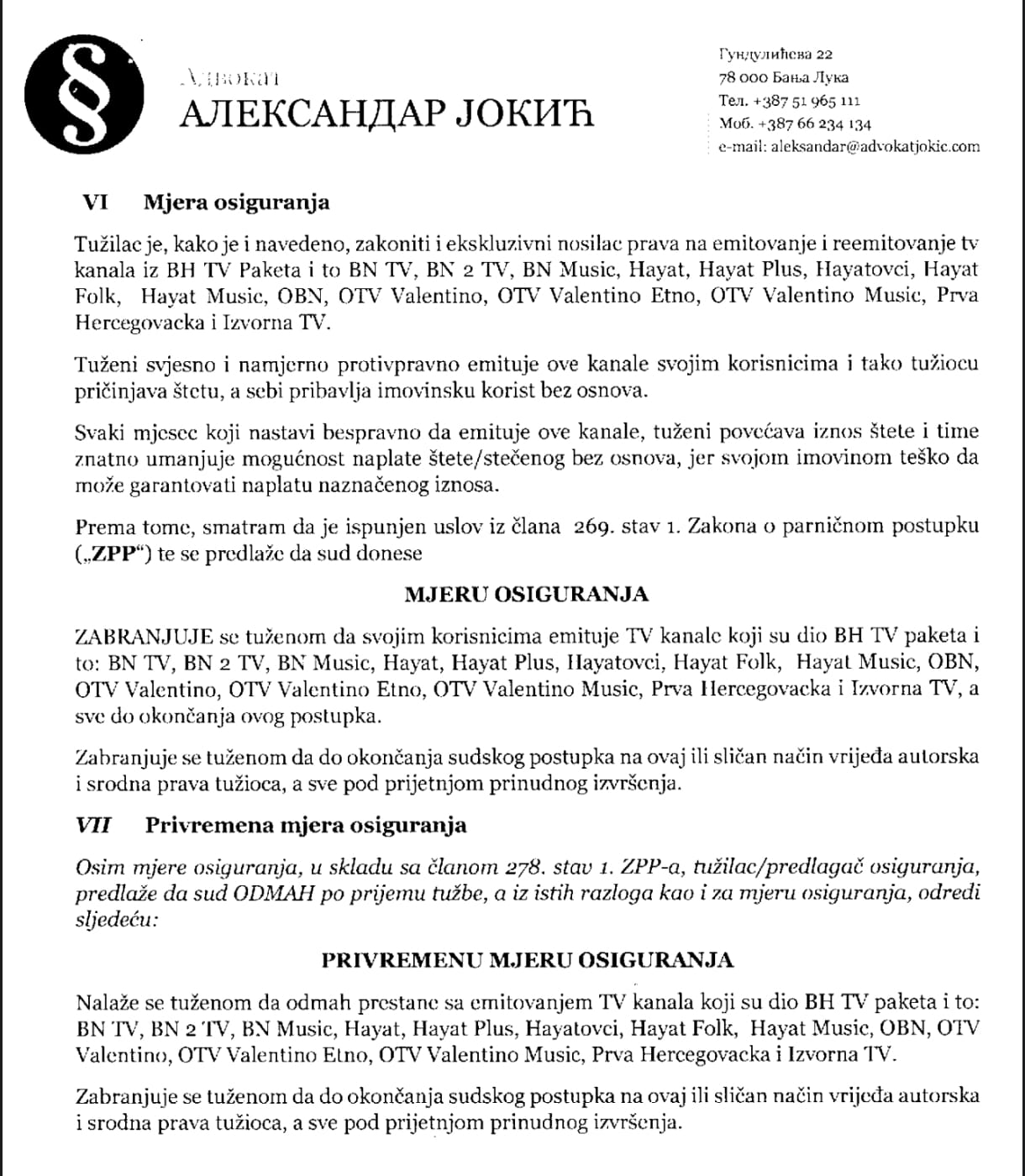 Naš stav je jasan, Hayat TV mora imati mogućnost da ostane prisutan u kablovskim operaterima. A da je to tako, dokazuje i tužba “Mjera osiguranja” od strane VIP Team prema operaterima u Federaciji BiH, kojom se traži gašenje pomenutih kanala, iako se mi upravo borimo da do toga ne dođe.
