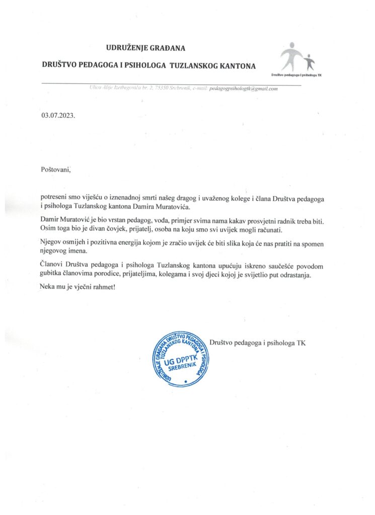 Društvo pedagoga i psihologa Tuzlanskog kantona uputilo je saučešće zbog smrti kolege i člana ove organizacije Damira Muratovića.