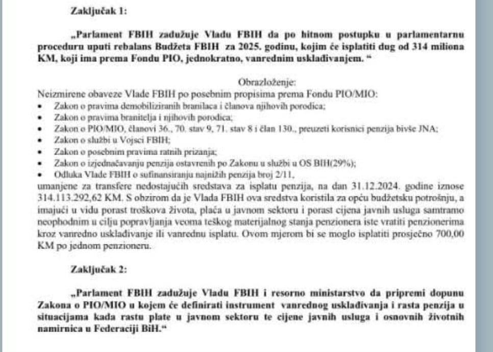 Klub zastupnika SDA u Predstavničkom domu Parlamenta Federacije BiH uputio je zvaničan prijedlog kojim se od Vlade FBiH traži da u hitnoj proceduri pokrene rebalans budžeta za 2025. godinu, kako bi se osiguralo 314 miliona KM za vanredno usklađivanje penzija i isplatu pomoći penzionerima. Prema ovom prijedlogu, svaki penzioner bi trebao dobiti jednokratnu novčanu pomoć u iznosu od 700 KM.