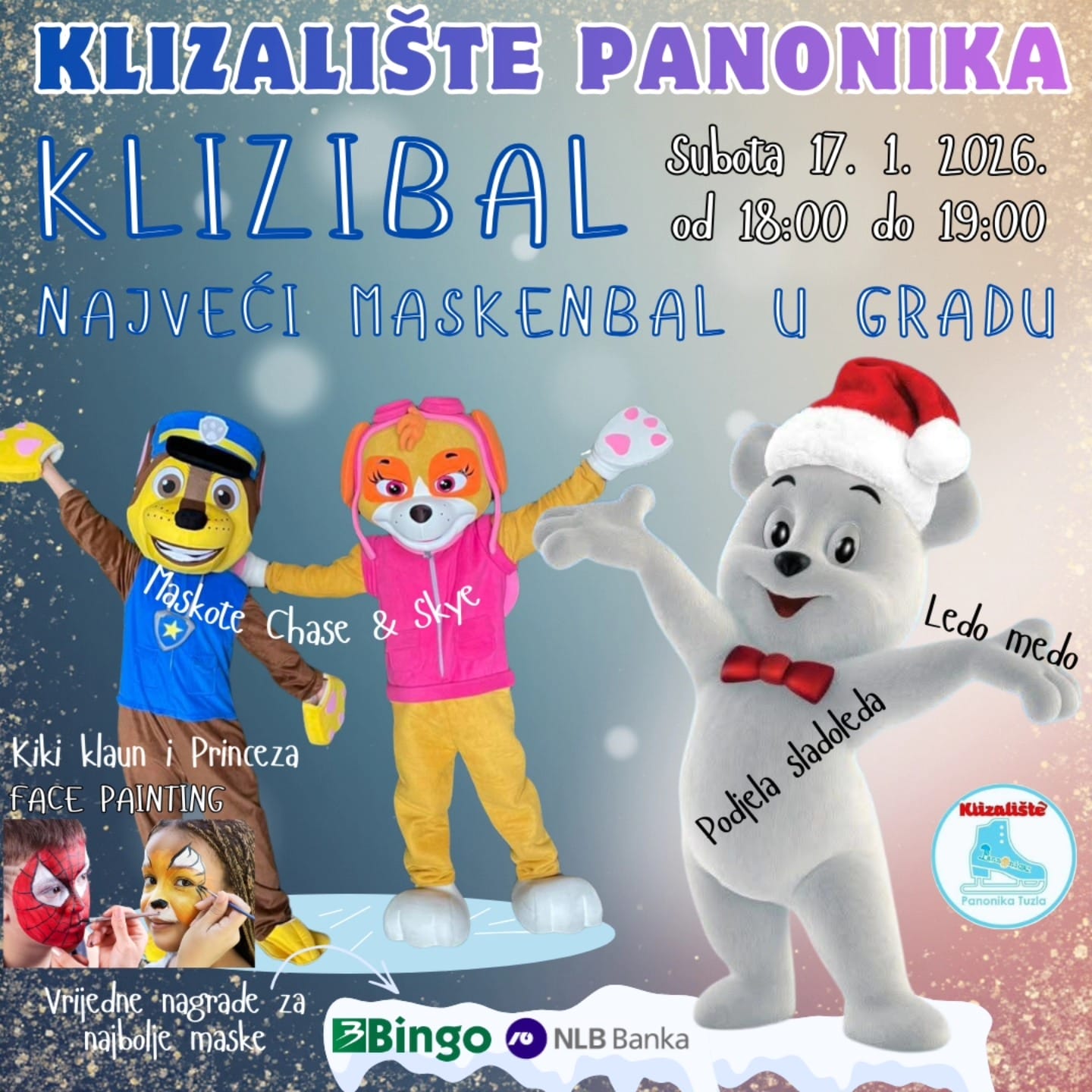 Gradsko klizalište Panonika u Tuzli danas, 17. januara 2026. godine, organizuje “Klizibal”, maskenbal na ledu koji je najavljen kao “najveći maskenbal u gradu”.