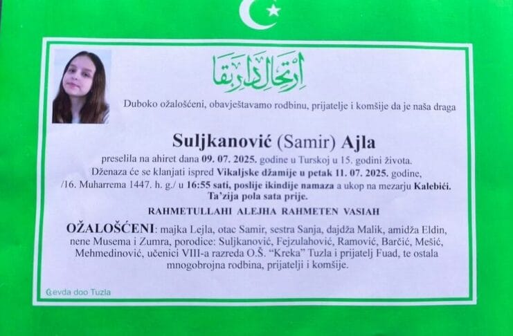 Sutra će u 16:55 sati biti obavljena dženaza namaza Ajli Suljkanović (15) ispred Vikaljske džamije.