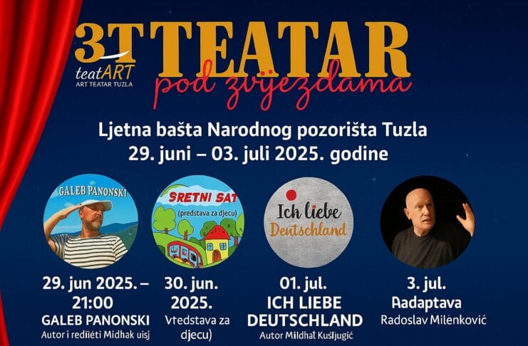 Na ljetnoj bašti Narodnog pozorišta Tuzla, od 29. juna do 3. jula 2025. godine, održat će se festival „Teatar pod zvijezdama“ u organizaciji teatART-a Tuzla. Publiku očekuju četiri pozorišne večeri koje će povezati poeziju, muziku, dječiju maštu i angažovano pozorište, a sve predstave počinju u 21:00 sat.