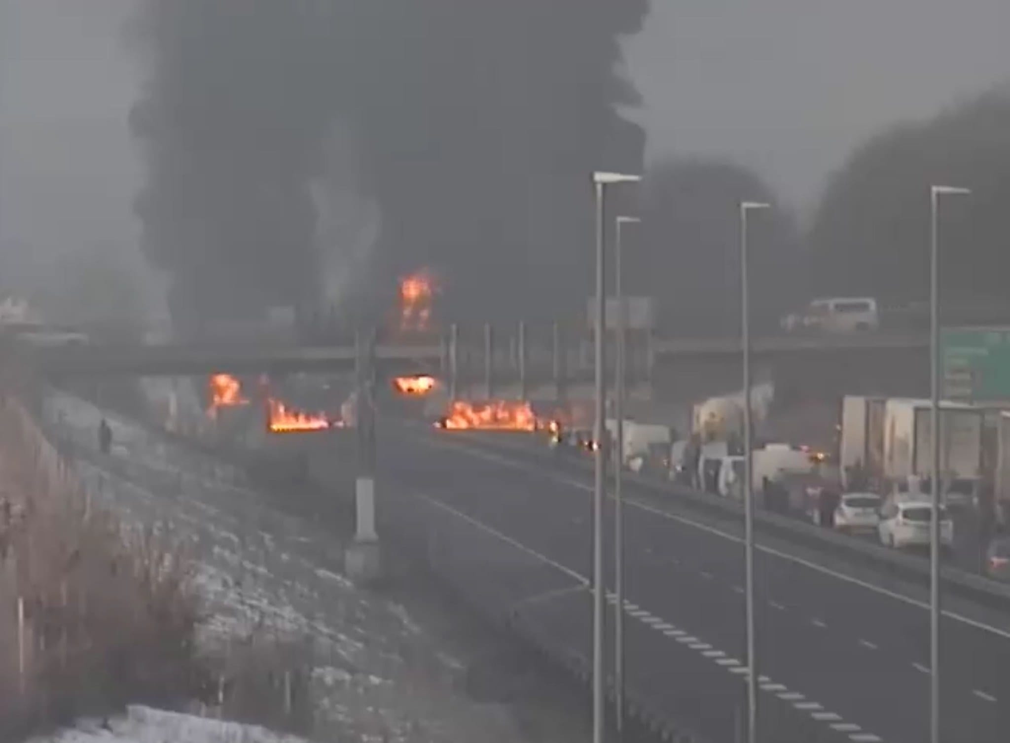 Vozači se upozoravaju da u kolonama formiraju spasilački koridor kako bi hitne službe mogle nesmetano proći. Snimci s nadzornih kamera pokazuju da je nakon sudara izbio požar, a vatrogasne ekipe su već na terenu.