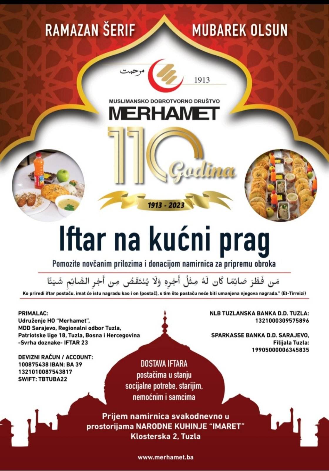 HO „Merhamet“ MDD Regionalni odbor Tuzla u toku ovog Ramazana realizira „IFTAR NA KUĆNI PRAG 2023.“ gdje se osiguravaju iftari za postače u stanju socijalne potrebe, korisnike Narodne kuhinje „Imaret“ u Tuzli, kao i postače na području tuzlanske regije koji zbog starosti i činjenice da žive sami nisu u mogućnosti sami pripremati obroke.