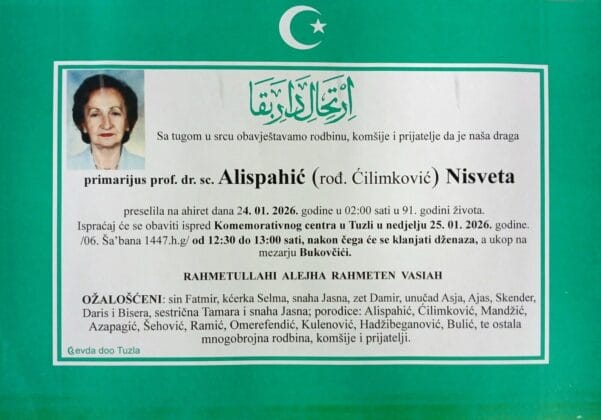 Ispraćaj će se obaviti ispred Komemorativnog centra u Tuzli u nedjelju 25. 01. 2026. godine od 12:30 do 13:00 sati, nakon čega će se klanjati dženaza, a ukop na mezarju Bukovcići.