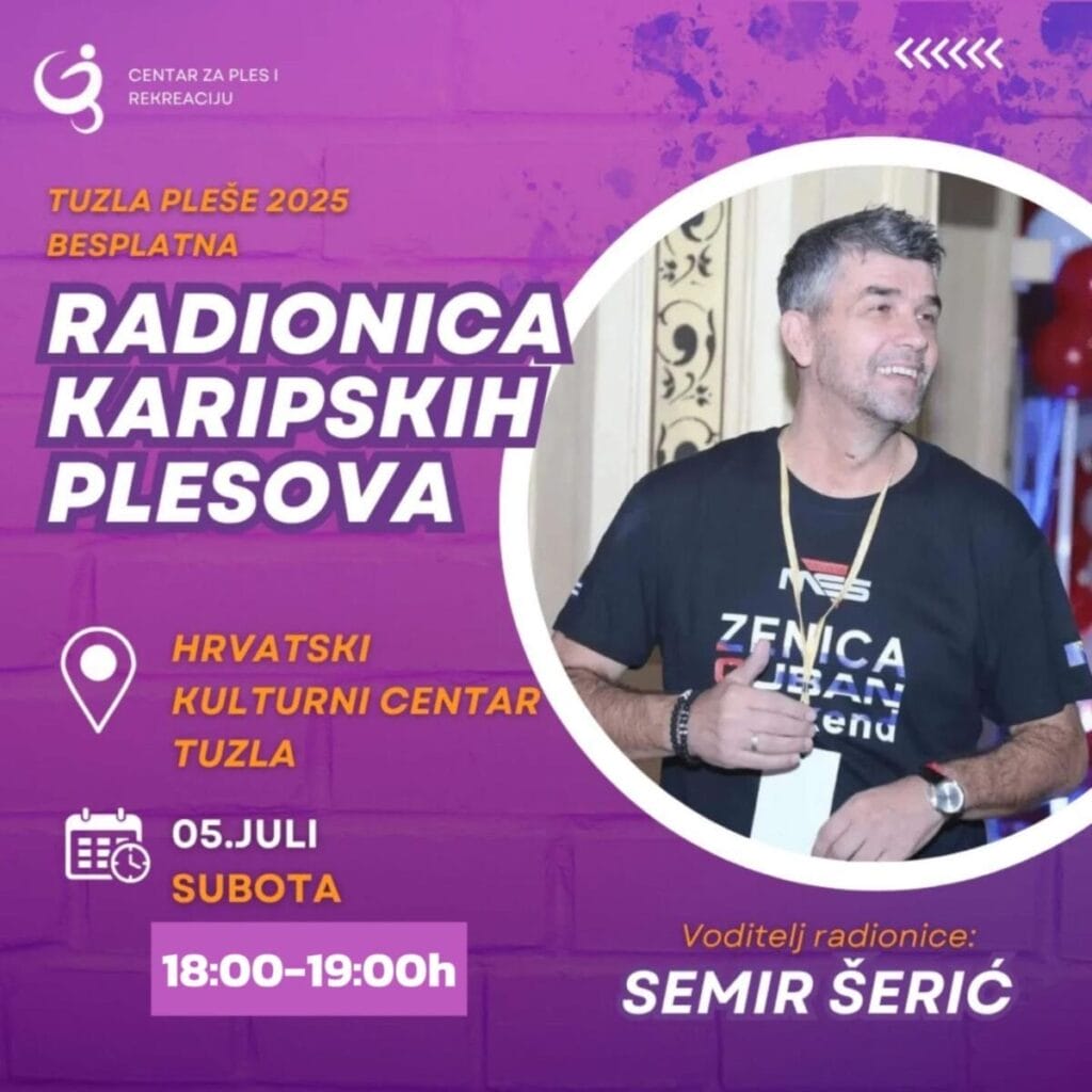 Kroz posljednje jednosatno plesno putovanje, sa početkom u 18 sati, provest će vas i istaknuti edukator iz Zenice, Semir Šerić. Na ovoj besplatnoj radionici naučit ćete osnove karipskih plesova: salse, bachata i merengue. U Centru za ples i rekreaciju Tuzla kažu da je Semir neumorni promotor plesne kulture u BiH i šire.