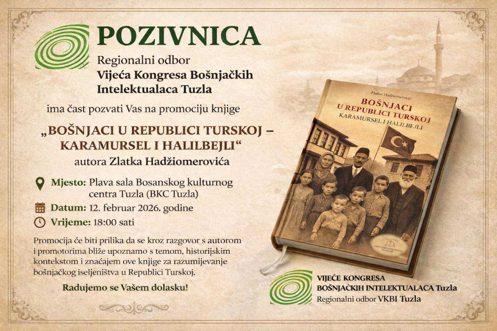 U Tuzli će biti održana promocija knjige „Bošnjaci u Republici Turskoj – Karamursel i Halilbejli“ autora Zlatka Hadžiomerovića, u organizaciji Regionalnog odbora Vijeća Kongresa bošnjačkih intelektualaca Tuzla.