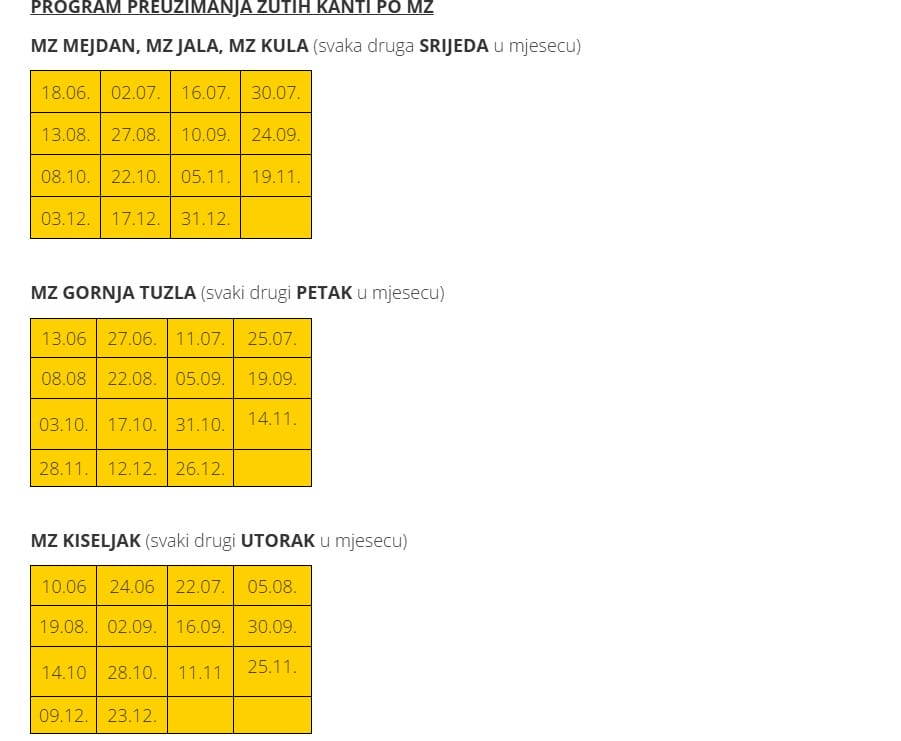 Za svaku mjesnu zajednicu, uspostavljen je tačan kalendar prikupljanja ambalažnog otpada: