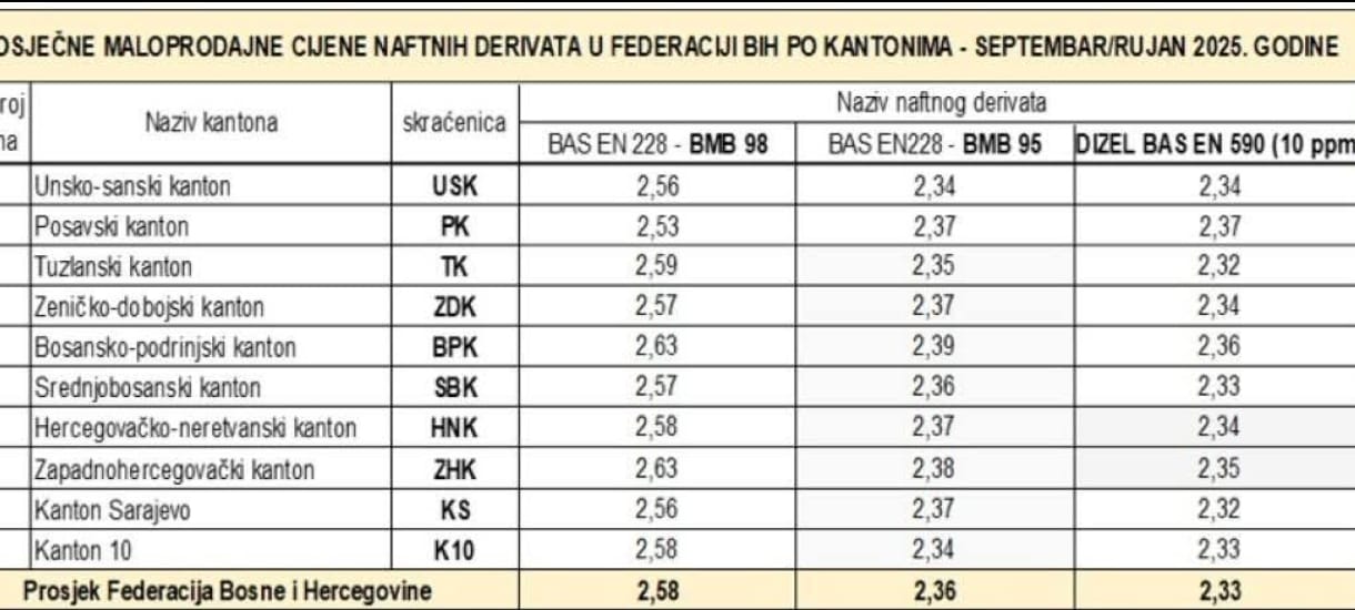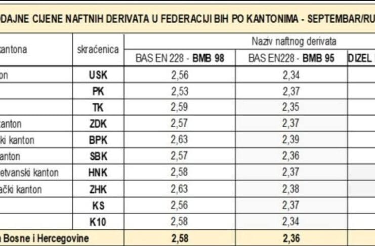 Prema istom izvoru, Federacija BiH je u septembru imala najniže prosječne cijene goriva u poređenju sa zemljama okruženja. Prosječna cijena benzina iznosila je 2,36 KM, dok je dizel koštao 2,33 KM po litru. Od susjednih zemalja, nižu cijenu dizela imala je samo Sjeverna Makedonija, gdje je prosječna cijena bila 2,19 KM po litru.