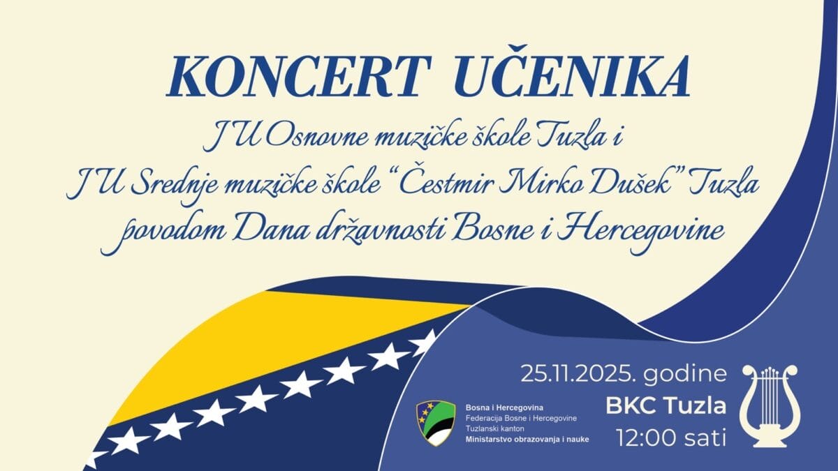 U organizaciji Ministarstva obrazovanja i nauke Tuzlanskog kantona, Osnovne muzičke škole Tuzla i Srednje muzičke škole „Čestmir Mirko Dušek“ Tuzla, u utorak, 25. novembra 2025. godine, biće održan svečani koncert učenika povodom obilježavanja Dana državnosti Bosne i Hercegovine. Koncert počinje u 12 sati u Velikoj sali Bosanskog kulturnog centra Tuzlanskog kantona.