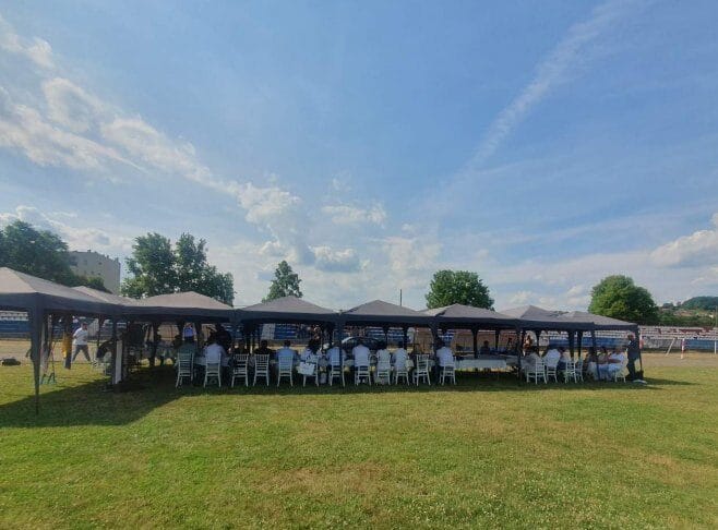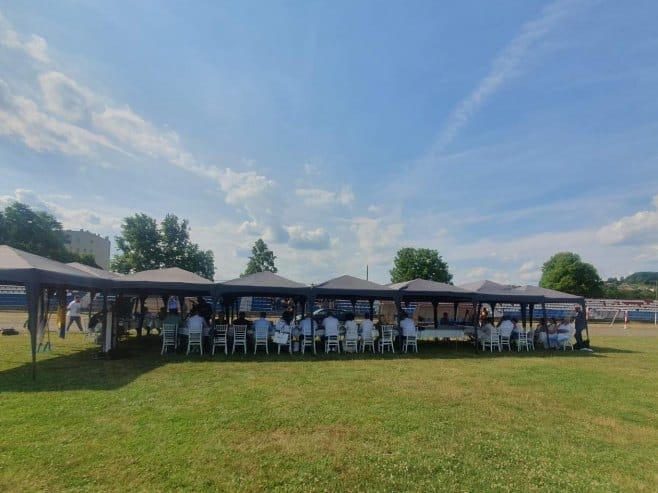 U neuobičajenim okolnostima, sjednica Skupštine grada Teslić jučer je održana na Gradskom stadionu, umjesto u zgradi gradske uprave. Razlog je poštivanje sudske mjere zabrane kojom se gradonačelniku Teslića i dvojici odbornika nalaže da budu udaljeni najmanje 100 metara jedni od drugih.